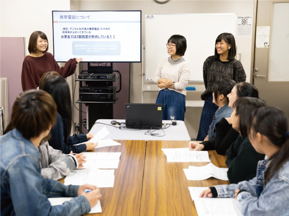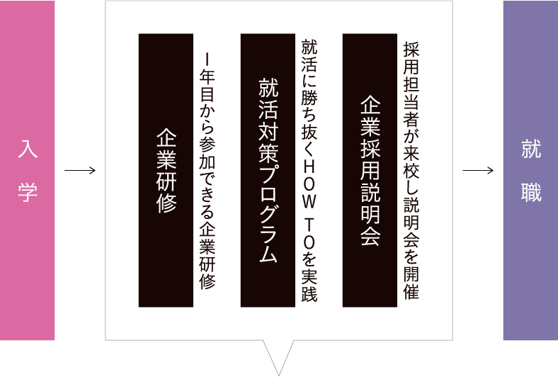 - 就職サポートでは、1年次から就職に向けたさまざまなサポートがスタートします。就職希望調査の定期的な実施から企業研修への取り組み、シューカツ対策講座などを実施し、学生のニーズに合った就職に向けてサポートしていきます。
