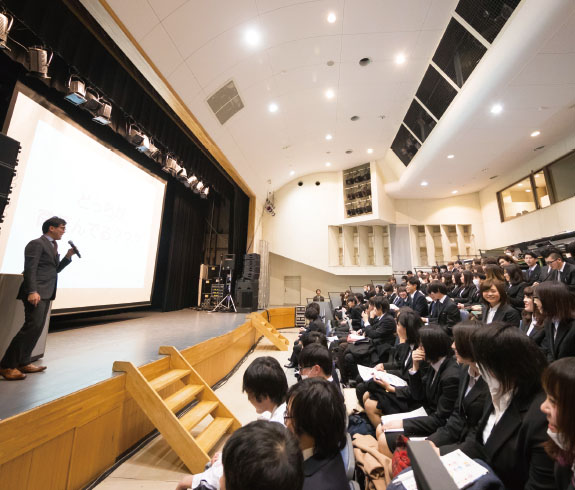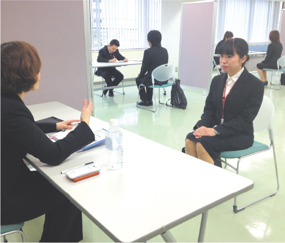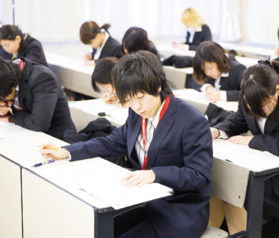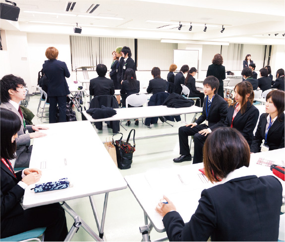 就職活動支援の総仕上げとして、年間5回の「シューカツ対策講座」を行います。身だしなみ・書類作成・一般常識・面接と、就職活動の流れに沿って、具体的な心構え、マナーのおさらいや成功事例などを紹介。目指す企業の就職試験本番に自信を持って臨めるよう、万全の体制でサポートします。