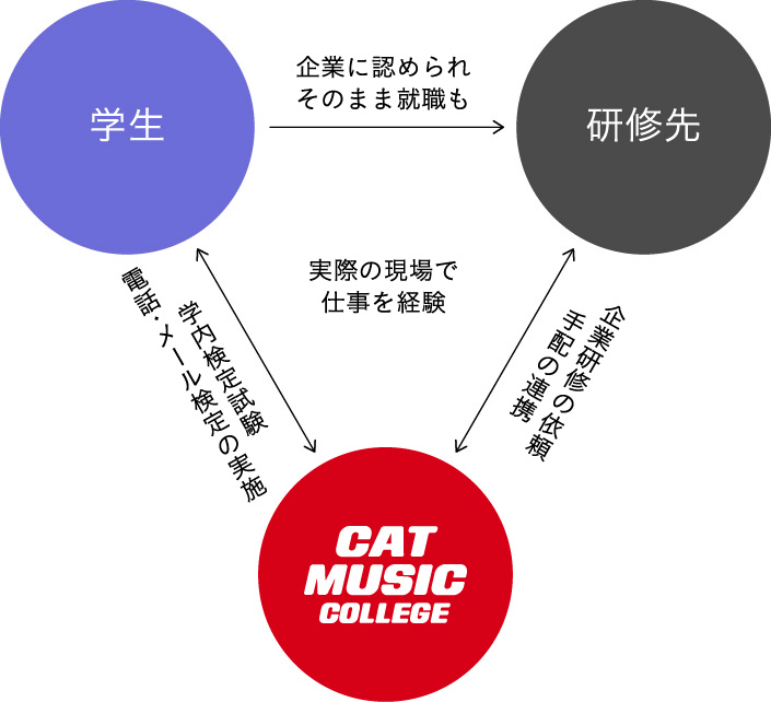 CATが企業研修を積極的に推進する理由は,研修先の現場で実力を認められると、そのまま就職が決まるケースが多いためです。多くの現場(イベント・コンサート・ライブハウス・スタジオなど)があるので、自分が目指す分野・職種だけでなく、それ以外にも、就職までに経験しておきたい現場や業務の体験も可能になります。