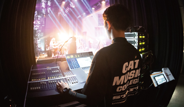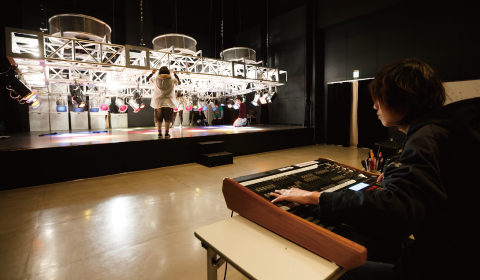 公共ホールに匹敵する規模のCAT HALLは、舞台装置、照明、音響など、すべての設備がプロ仕様。プロのアーティストも使用する本格的なコンサートホールです。ミュージシャン学科やダンス学科・総合学科のステージ実習をはじめ、音楽技術学科の授業、学園祭、卒業コンサートなどにも使用されます。