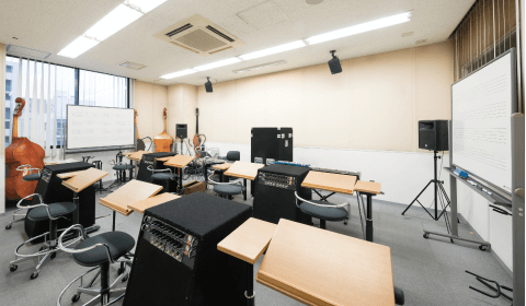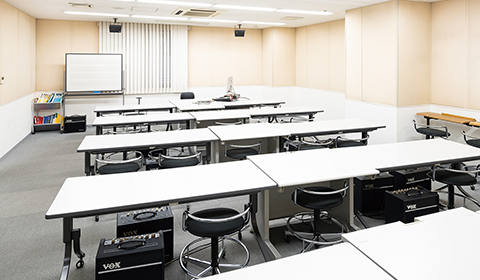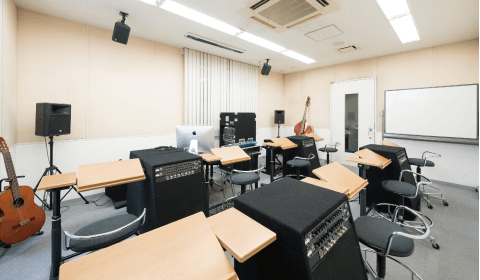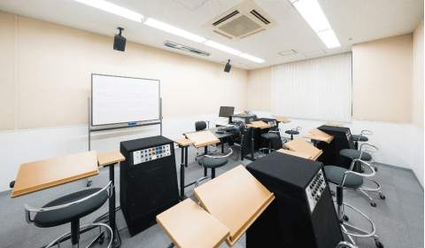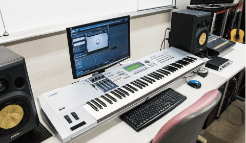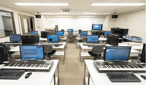 音源制作ソフトやオーディオインターフェイスなどが、設置されたDAW専用実習教室。一人一台の環境で音楽制作に取り組むことができます。