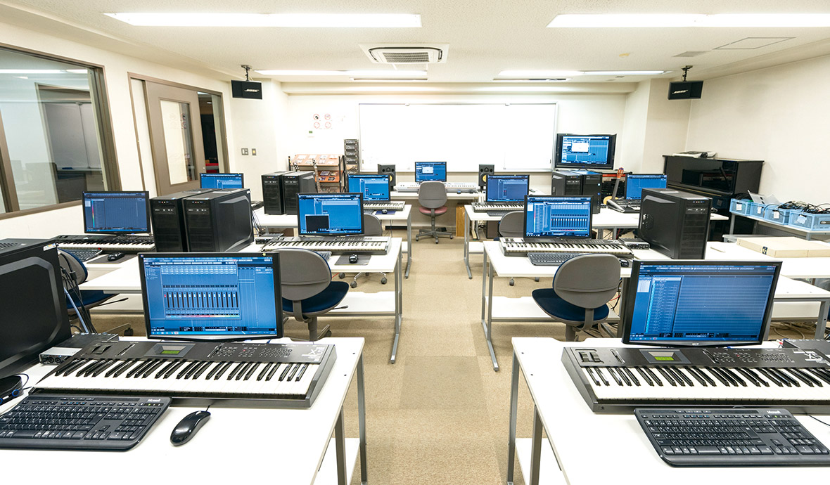 音源制作ソフトやオーディオインターフェイスなどが、設置されたDAW専用実習教室。一人一台の環境で音楽制作に取り組むことができます。
