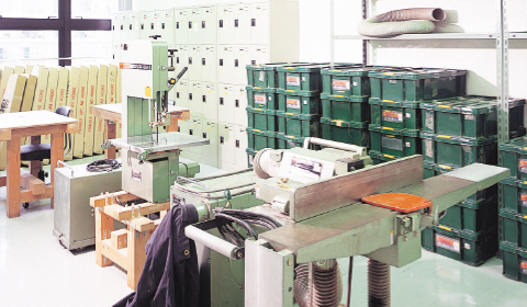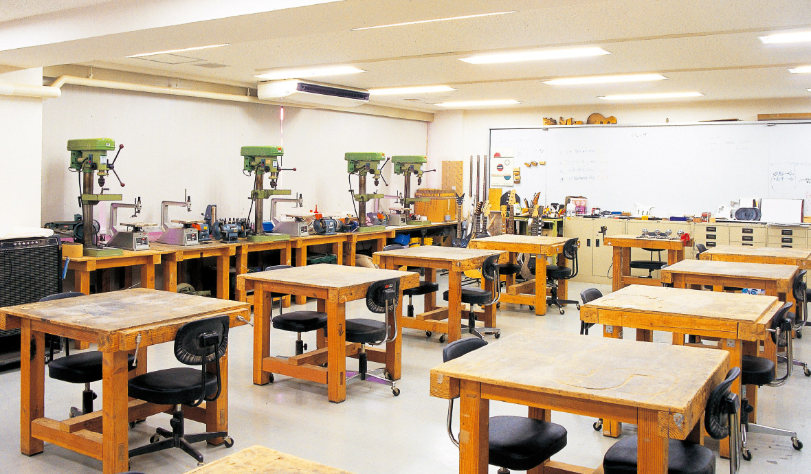 実際のギター工房をモデルに設計された「クラフト実習室」、プロの現場では必要不可欠な大型機械類(ピンルーターやプレーナーなど)をそろえた「機械室」、木材のシーズニングを行ったり塗装中の楽器を保管する「乾燥室」、楽器工場に匹敵する設備を整えた「塗装ブース」があり、楽器製作のすべての工程を学内で行うことが可能です。