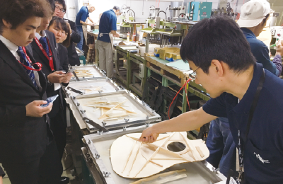 日本を代表する楽器製造工場や工房を訪れる特別授業。大規模な製造設備を持つ工場から、手作業中心の工房まで日本の楽器製造の現場を体感します。