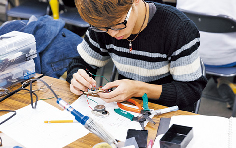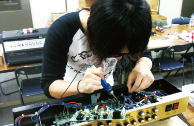 楽器内部の配線、エフェクター・アンプ、音響機器など「音」を電気の側面から学習。講義形式の授業に加え、エフェクター製作やアンプ修理などの実習授業も実施します。