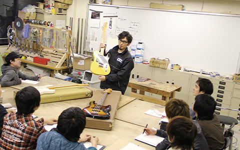 ギター・ベースの取り扱い方法から、調整や組み立て、修理(リペア技術)を基礎から身につけます。アコースティックギターのリペアについても学びます。
