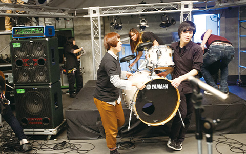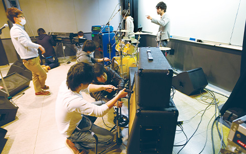 ミュージシャンの楽器サポートや機材のセッティング、PAの基礎知識を用いた音像構築補助等、多岐に渡るテクニシャンワークを音響実習形式で学びます。