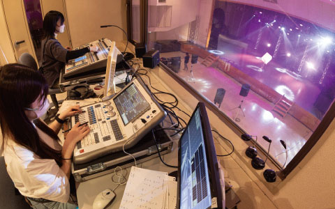 光と色が交錯するドラマチックなステージの演出に欠かせない照明スタッフ。ピンスポットやムービングライトの基本的なオペレーションをはじめ、ステージデザインに基づく照明プランの立案から設営、セッティング、演出までを習得。豊富な実習を通して現場対応力を磨きます。